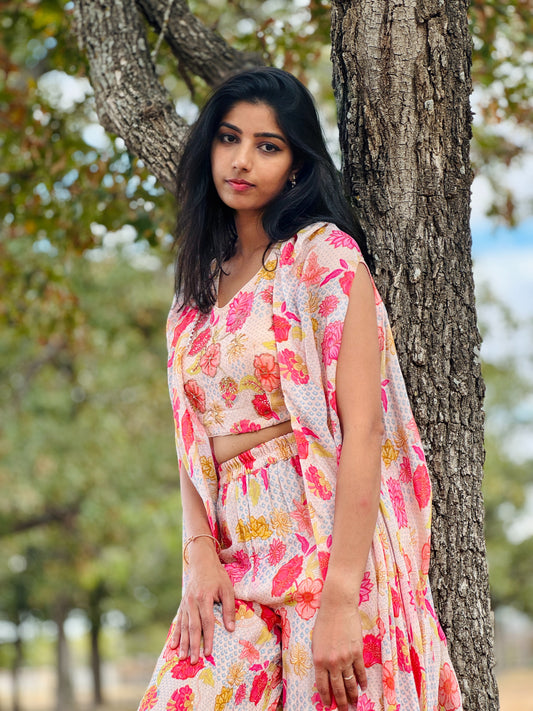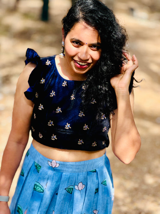Velvet Crop Top with Printed Georgette Lehenga