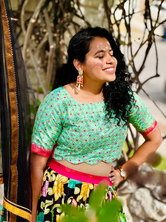 Kalamkari Lehenga with Mint Green Crop Top